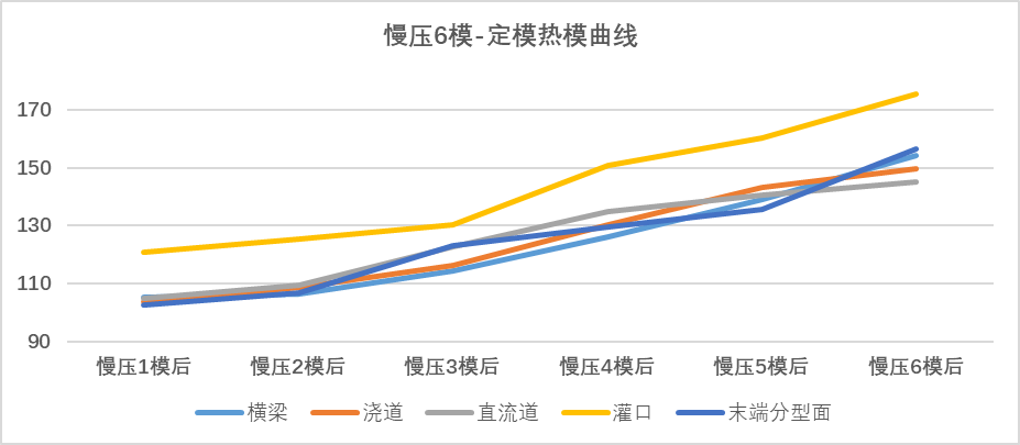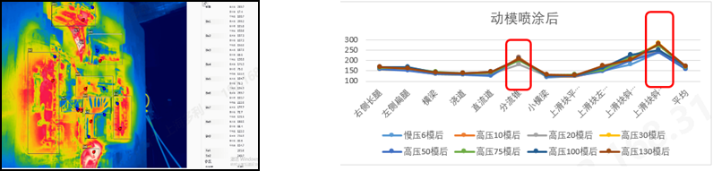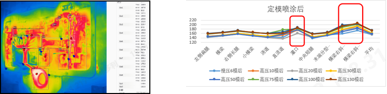 以上都是取的喷涂后的模温: 慢压6模后的模温和100模后的模温对比差异约18.5度 高压件动模侧温度趋势