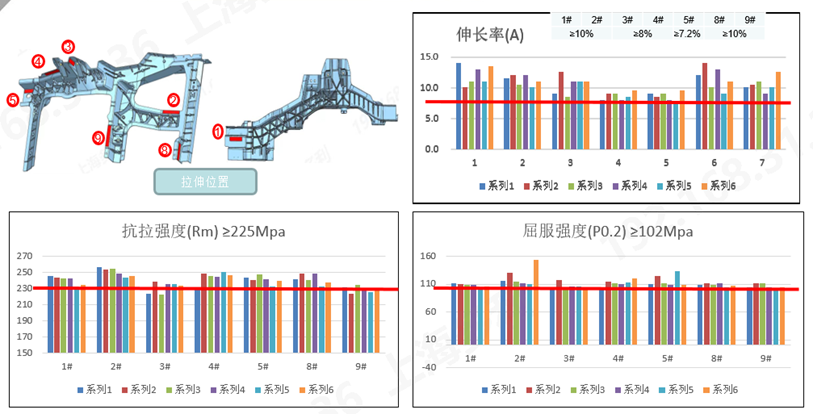针对关键位置的的内部气孔检测,如轮罩区、中间横梁区、门槛梁区等位置气孔质量合格,未发现异常。 ③机械性能