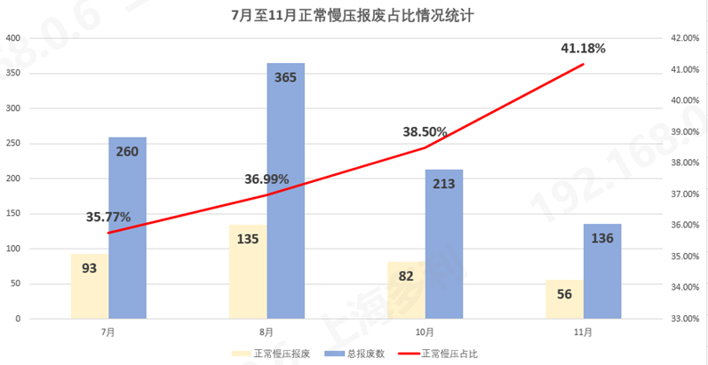 从优化的理论和实践的结果可以看出,该优化是具备可行性的。 后续我们跟客户进行了沟通,将实验报告以及结论进行了汇报,得到了客户的同意。 04 热模慢压件优化后报废情况 从7月份至11月,生产零件数量29233件,报废件数量共974件,其中热模件报废共366件,占比37.6%,较上半年减少20个百分点。