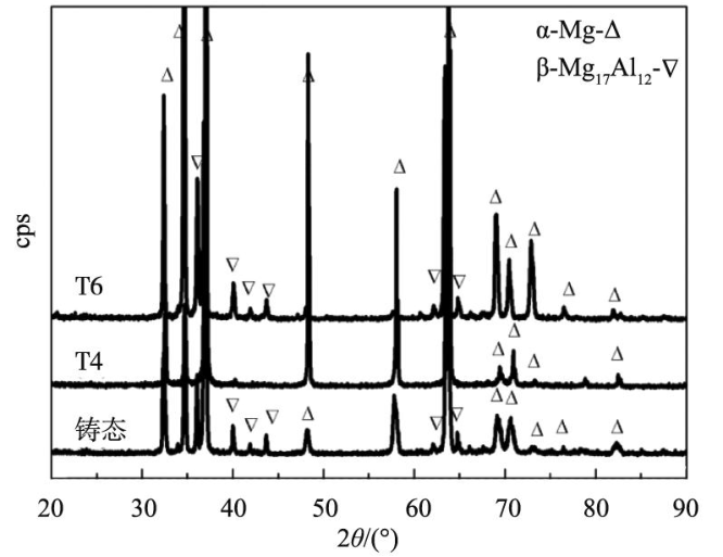 图1 不同热处理条件下镁合金表面腐蚀形貌 由图2的XRD图谱分析可知,T4工艺促使β相完全固溶于镁基体内部,而经T6处理后该相再次发生析出。此外,基于公式(3)的计算结果,铸态试样中β相占比为7.9%,T6处理后则提升至12.6%。这一显著的析出增量与微观形貌,如图1(e),表现出极好的一致性。Yang等人通过对Mg-3Sn-1Mn镁合金热处理后发现类似的试验结果。