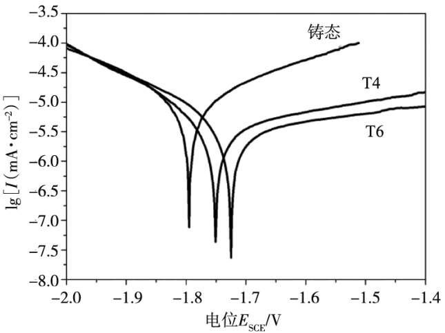 图2 不同样品的XRD图谱 2.2 浸泡及电化学腐蚀测试 为了更好地证明热处理对镁合金腐蚀性能的影响,将三种不同条件的镁合金浸泡在Na2SO4溶液中三天,通过失重法计算了各自条件下的腐蚀速率(Vcorr)。此外,还测得了三种试样的极化曲线,如图3所示,失重法以及极化曲线各自的计算结果如表2所示。