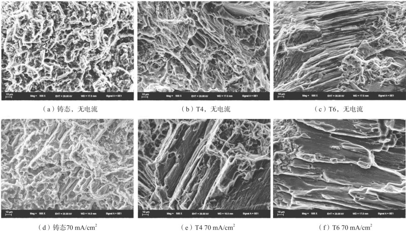 图6 镁合金断口形貌 03 结论 (1)热处理工艺显著调控了AZ91镁合金的微观结构特征。经T4处理后,粗大骨架状β相完全溶解于基体中,而T6处理促使β相在晶界及晶内形成非连续层状与连续颗粒状析出相,实现组织均匀化。 (2)热处理有效提升了材料腐蚀抗力,其中T4处理使腐蚀抗力较铸态提升44.4%,T6处理提升37.6%。T4抗腐蚀性增强源于β相完全溶解导致基体铝元素浓度增加,抑制了微电偶腐蚀;T6则通过析出强化与弥散强化机制提升抗腐蚀性。腐蚀优先发生在晶界区域,主要源于晶界高能态及缺陷密度较高。 (3)在相同电流密度下,T4与T6处理样品的氢致脆化倾向较铸态分别降低15%和13.5%。氢脆抗性提升主要源于热处理优化了氢陷阱分布(β相溶解及杂质减少),降低了基体中氢原子偏聚程度,从而减少氢致损伤。 (4)随着充氢电流密度的增加,三种不同状态下的镁合金断口都展现出由准解理向解理转变的趋势。 作者