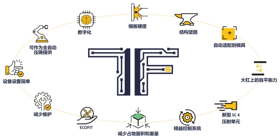 以定制化为准则»满足客户的需求: 意特佩雷斯高斯的新一代TF压铸机采用模块化设计,更加灵活,在1400吨至11000吨合模力的12种设备尺寸中,您可以选择55种以上不同的优化配置,以及高达6种不同类型的压射选项和两种版本的合模机构,每个核心模块都经过性能预测试和预认证- 现场组装,快速且无需预构建,跳过了可以避免的步骤,您可以更快地获得所需的设备,这也是关键的竞争优势。