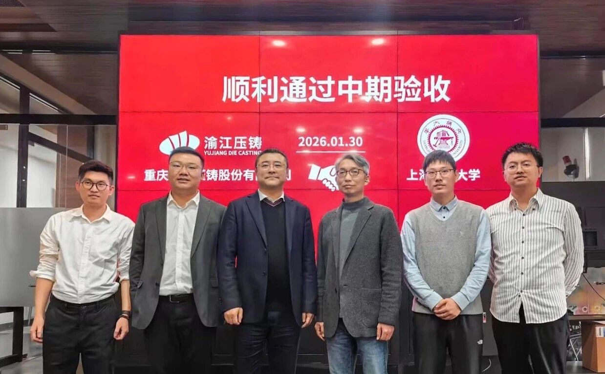 阶段性目标的达成,为后续机型试制与规模化工艺验证奠定了坚实基础。下一步,双方将着力推进成型过程的智能化控制、缺陷在线监测与工艺-材料-装备的全局协同优化,加速实现技术从实验室到产业化的跨越。 02.「协同赋能」 产业链闭环驱动技术高效转化 随后,上海交通大学与渝江压铸的合作项目顺利通过中期评审。本次验收聚焦于技术成果向规模化生产场景的转化路径,双方围绕量产过程中的工艺窗口优化、质量一致性控制以及综合成本管理等关键议题,开展了深入且务实的交流。