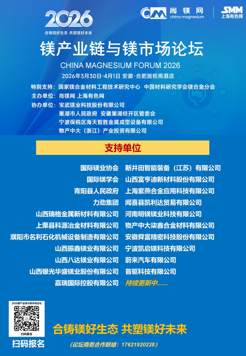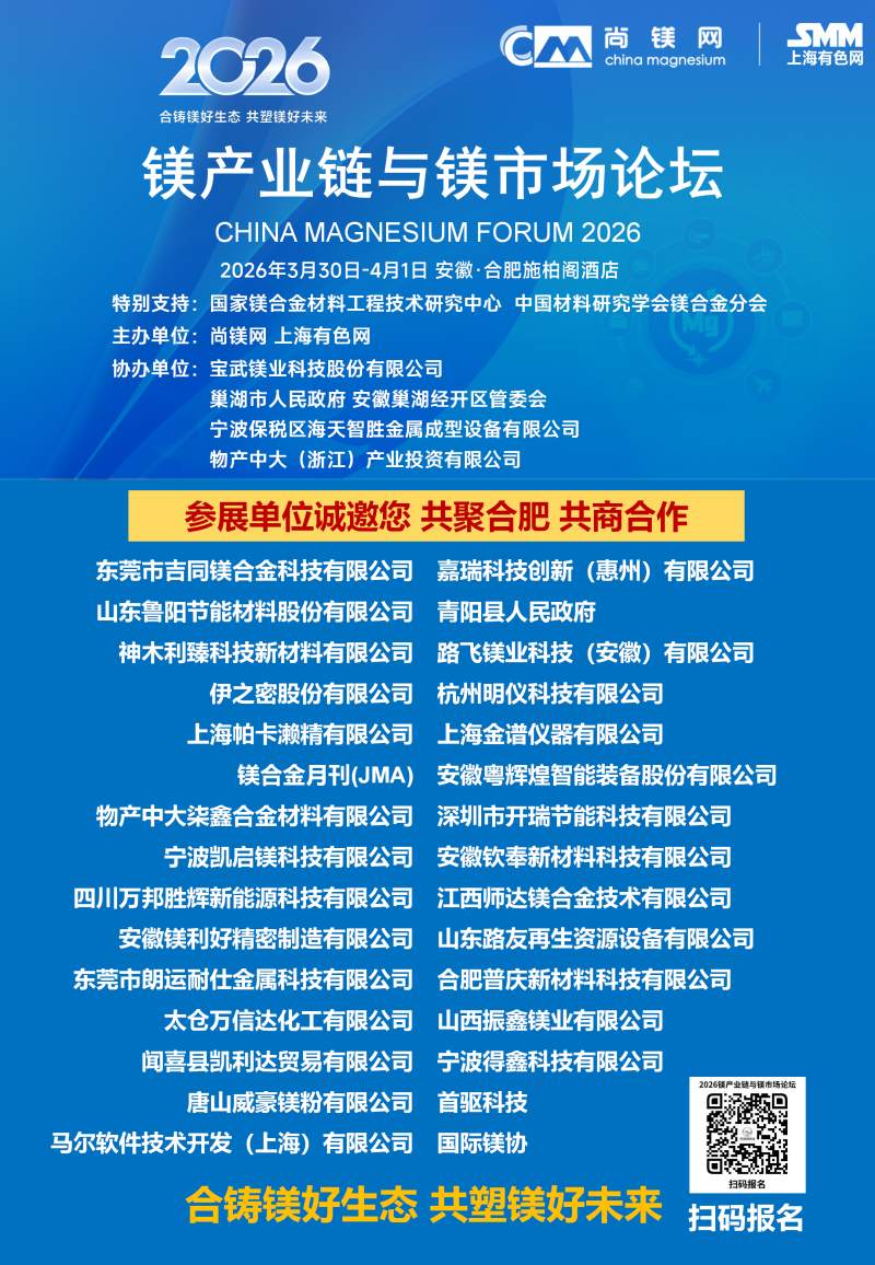 2026年的镁行业,正站在供需改善、需求爆发、政策加持的关键拐点,一场属于镁合金的春天正在到来。春光不等人,商机不重来。当下正是布局镁产业链、锁定订单、拓展渠道、升级技术的黄金窗口期。值此时刻,"2026镁产业链与镁市场论坛"将于3月30日-4月1日在合肥市盛大启幕。论坛由国家镁合金材料工程技术研究中心、中国材料研究学会镁合金分会特别支持,尚镁网、上海有色网联合主办,宝武镁业科技股份有限公司、巢湖市人民政府、安徽巢湖经开区管委会、宁波保税区海天智胜金属成型设备有限公司、物产中大(浙江)产业投资有限公司等单位协办,得到了镁产业链众多骨干企业的支持和参与。这将是本论坛连续第四年举行。