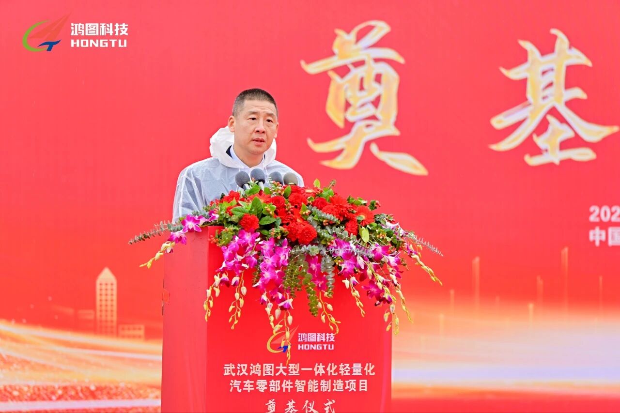 广东鸿图党委书记、董事长刘卫东致辞 广东鸿图党委书记、董事长刘卫东在奠基仪式上,对各级政府及合作伙伴的支持表示感谢。他表示,武汉是汽车工业重要战略高地,十二年前鸿图布局武汉已实现深度融合;此次二期项目是响应国家“双碳”战略、顺应汽车产业发展趋势的关键举措,将引入超大型一体化压铸装备与核心技术,把武汉基地打造为全国重要增长极,助力武汉“世界车谷”建设。