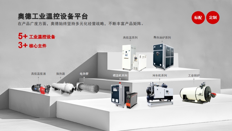随着奥德常大电热的成立,奥德工业温控设备产业链平台日趋完善。从模温机、冷水机、锅炉三大温控设备,到高低温泵浦、换热器、电加热管三大核心主件,历经二十余载深耕,奥德已构建起从关键部件到整机系统、从通用设备到高端定制的一体化温控解决方案能力。