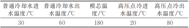为了确保铝合金液在填充过程中保持增速,根据实践验证,合金液在填充过程中,单级加速比小于4时压力损失较小。模具料筒截面积、主流道截面积、内浇口截面积比经过优化为9.8:3.17:1。5股主进料口可以满足铝合金液快速充填逆变器壳体主体部分和水冷却位置,但是到达侧壁的阻力较大,经过现场测量失温较大,侧壁处会产生冷隔、花斑等缺陷,因此模具侧面需要增加两路辅助浇口进料来改变型腔内冷料和高温气体的流向,减小充填阻力,降低铸造压力,避免产生胀模现象。铸件分型面披锋控制在0.12 mm以内,以消除毛刺。 模具设计了普通冷却运水和3组高压点冷装置,见表2,实现了模芯、滑块、内浇口等处的温度基本一致,均保持在180 ℃左右。高压点冷将铸件局部壁厚处的热量通过纯水传导出去,在一个压铸循环周期内将模具温度降到160 ℃左右,实现了模具温度的动态平衡,不需要通过喷水来降低模具温度,缩短了喷雾时间,降低局部粘模现象,改善了因大量喷涂可能产生的气孔。 表2 冷却系统设计