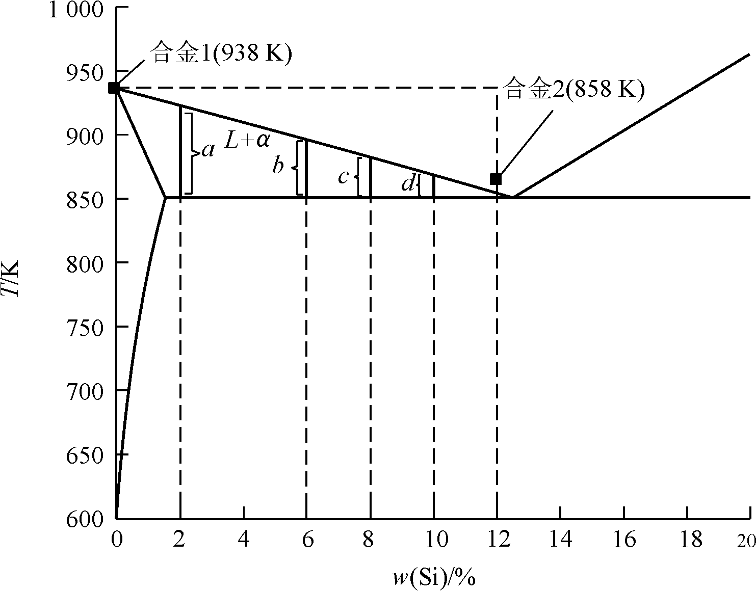 图6 图4中框标区域的放大图像 利用Fluent软件UDF后处理模块,将4组熔体的温度场与溶质场结合处理,对混合熔体进行网格筛选,得到了凝固网格示意图,见图7。过冷区域的筛选是根据当前网格内Si浓度下的液相线温度,结合实时温度场,低于液相线处的网格作为过冷区域。 图8为受控扩散凝固技术形核原理图。纯Al与Al-12Si合金发生强制对流混合,在两熔体发生接触的界面前沿,低温熔体对高温熔体激冷,产生了一个呈现过渡态的过冷区域,在此区域传热与传质的方向相反,液相中自发形核,晶核得以生长并展现出非枝晶形貌。在此过程中,固液界面前沿,晶核始终向着纯Al一侧生长,一定的过热度保证了过冷区域稳定存在,而传热的速率高于传质,是非枝晶形核的重要依据。 图9为4组模拟的形核示意图。当母合金纯Al比例大于33.3%时,形核率受过冷度制约,低温熔体无法为纯Al提供足够的过冷度,新生晶核与再生晶核在这种相对过热的状态下合并粗化,形成了尺寸较为粗大的晶粒,形核率较低。而纯Al比例低于33.3%时,形核率受纯Al本身制约,非枝晶生长依赖于初生α相的析出,初生α相则首先由纯Al中析出,同时,纯Al作为被过冷的高温熔体,其比例过低导致过冷区域减少,综上所述,形核率降低。图10为Al-Si二元相图(使用Factsage软件绘制),a、b、c和d分别为母合金纯Al比例为83.3%、50.0%、33.3%和16.7%经过CDS技术混合后目标合金冷却过程中初生α-Al相的析出区间。