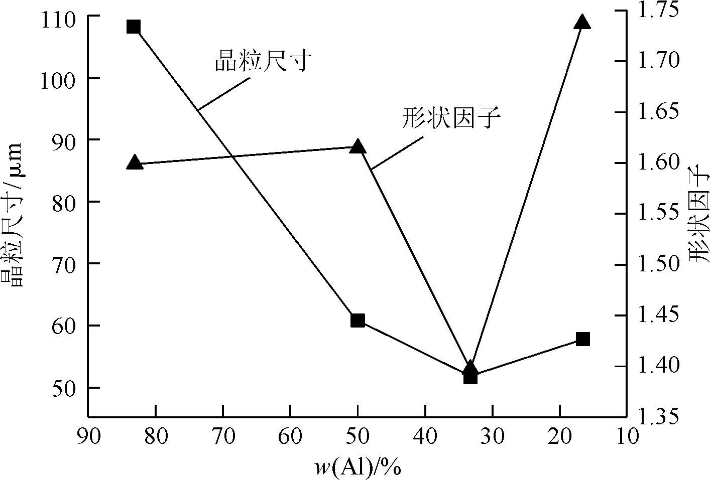 图12 纯Al与Al-12Si以不同比例混合后所得的合金的显微组织 图13为Al-4Si合金与Al-12Si合金通过CDS技术金属型铸造的Al-8Si合金的显微组织。与图12c对比,在Si含量相同的情况下,共晶Si相占比略高,其中非枝晶向蔷薇状转变。母合金纯Al比例低于33.3%或为0时,共晶Si相存在抑制非均匀形核并诱导其向树枝晶发展的趋势,由此推断,纯Al在母合金中有不可忽视的作用。母合金在CDS技术下混合时,为非枝晶的生长提供了形核基底,适当的纯Al占比可以达到最理想的形核率。图14为不同Al含量的合金初生相的平均晶粒尺寸和形状因子。可以看出,随着纯Al含量减小,合金粒尺寸和形状因子均先减小后增大,在Al含量为33.3%时合金组织平均晶粒尺寸和形状因子最小,分别为51.98 μm和1.39。
