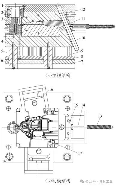 图8 冷却系统 3 模具设计 3.1 模具结构 模具结构如图9所示,型腔板镶件12通过螺钉固定在定模板3上,型芯镶件11通过螺钉固定在动模板4上,导柱设计在定模板一侧,便于开模后机械手取件,压室1由双层水路冷却,分流锥2采用水井冷却,水井底部用黄铜密封。模架由定模板3、动模板4、垫块5构成,其中动、定模板须经过调质处理。型腔板镶件主分型面与定模板平面平齐,型芯镶件主分型面高出动模板平面0.15~0.2 mm,即设计合模间隙为0.15~0.2 mm,动模板对应溢流槽排气位置开设深度为0.1 mm。为了防止模板变形,在分流锥2下方设置支撑柱,在模板中间也设置支撑柱,需避开顶杆孔位置。推板8采用4根复位杆9导向,垫块5加工成整体式兼做底板用。动模板4个角设计30 mm×30 mm×8 mm撬模槽,在动、定模板上各设置4个大孔,方便拆装型芯和型腔板镶件。模板上吊模孔为M24 mm,其中天侧为避开顶部滑块拉杆须设置左右2个吊模孔。