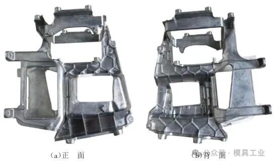 图9 模具结构 1.压室 2.分流锥 3.定模板 4.动模板 5.垫块 6.支撑柱 7.推板 8.推杆固定板 9.复位杆 10.斜导柱 11.型芯镶件 12.型腔板镶件 13.弹簧 14.拉杆 15.滑块 16.滑块 17.滑块 3.2 模具成型零件 型芯镶件11、型腔板镶件12、滑块15~17都采用进口合金钢8418制造,8418模具钢是一种含铬、钼、钒的高性能热作模具钢,具有较好的抗热疲劳龟裂、热冲击开裂、热磨损、塑性变形的性能,这些性能使其成为压铸、热锻、热挤压模用钢的最优选择。模具零件粗加工后热处理前须进行去应力处理,淬火硬度为46~48 HRC。模具零件加工完成后,对型芯、型腔板镶件进行喷丸强化处理,喷丸强化处理是专门针对压铸模零件的表面处理技术,其主要目的是提高模具零件的耐磨性、抗腐蚀性和热疲劳性能,以延长模具的使用寿命。型芯及型腔板镶件外形尺寸应比动、定模框小0.05~0.08 mm,四角定位配合公差为0.03~0.05 mm。 3.3 铸件成型 模具装配及经过质检合格后,且保证开合模各个动作(开合模、推出等)顺畅后试模,根据铸件信息及压铸机参数,设定第1次试模参数,如表2所示,第1次试模样件,如图10所示。 表2 试模报告