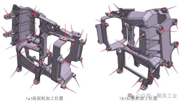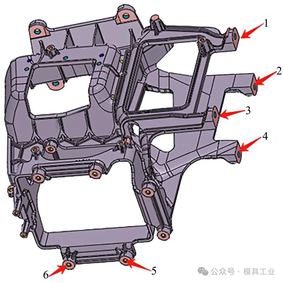 图2 铸件加工余量 2 成型分析 2.1 难点分析 铸件成型难点:①笼式结构复杂,错综复杂的加强筋影响熔体流向,解决熔体对冲时困气问题,要求精准控制流道流量及合理设计溢流槽和排气槽;②铸件壁厚差异较大,型腔末端充填困难;③铸件末端有6处安装孔位,如图3所示,需保证铸件内部的致密性,无气孔、缩孔等缺陷,这样才能满足主机支架的安装强度要求。