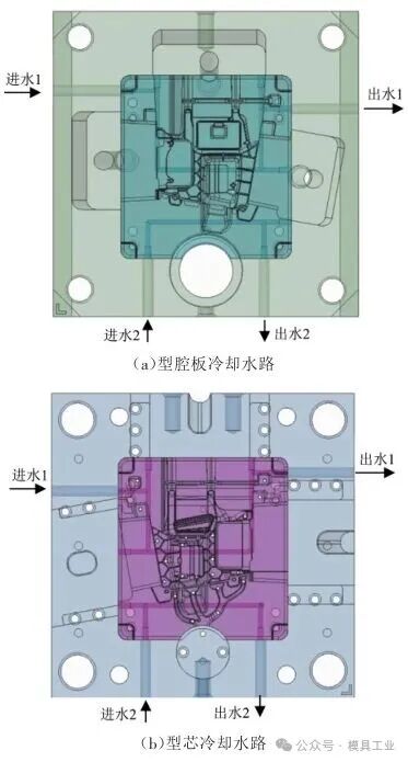 图7 型腔溢流槽 冷却系统设计中压室采用双循环水路,以确保冷却效果,提高冲头的耐用性,分流锥采用水井冷却设计,型芯及型腔板各布置2条直径为φ8 mm的水路,如图8所示,距离铸件为25 mm,水路接头采用1/4PT管牙,所有冷却水管穿过模架直接锁在型芯和型腔板侧面,这样能有效防止因使用密封圈老化而出现漏水现象。