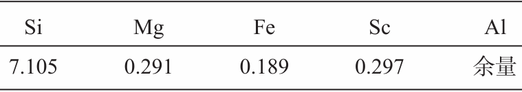 图2 试验合金的DSC曲线 2.2 SEM 分析 图3为铸态合金的SEM及EDS结果图。从图3(a)可以看出,铸态合金组织主要由α-Al、晶界附近黑色衬度的共晶Si、浅灰色衬度的含Sc相、富铁相组成。晶界附近存在尺寸较大的片状共晶Si以及较宽的α-Al+Si共晶组织区域呈半连续分布。对图3(a)中白色方框区域进行面扫分析,结果如图3(b)-(f)。分析发现Al基体中固溶了部分Si、Mg、Fe和Sc元素。呈骨骼状形貌的第二相所在位置同时富集了Al、Si、Mg和Fe四种元素,初步推断为π-AlSiMgFe相。棒状形貌的第二相则主要由Al、Si和Fe三种元素富集,确定该相为β-AlFeSi相。此外,短棒状形貌相则主要由Al、Si和Sc三种元素富集,为AlScSi三元相。表2为图3(a)中A、B和C所指位置的EDS点扫描结果,结合图3(b)-(f)面扫结果进一步确定A点位置相为π-AlSiMgFe,B点位置相为β-AlFeSi,而C点位置相为AlScSi三元相。本课题组前期研究得到该含Sc三元相为AlSc2Si2相,含Sc相的生成会消耗一部分Si和Al元素,对细化铸造铝硅合金中共晶Si相的有着重要作用。