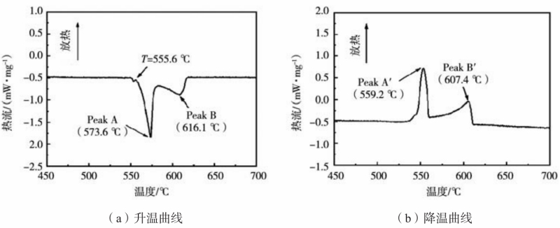 图1 拉伸试样尺寸 02 结果与分析 2.1 DSC 热分析 为了制定合理的热处理工艺,防止合金固溶过程中出现过烧现象,对合金进行了DSC热分析,结果如图2所示。升温过程如图2(a)所示,可以看出,吸热峰Peak A峰值温度为573.6 ℃,该吸热峰的形成归功于合金升温过程中发生的共晶反应Al+Si → L,反应的起始温度为555.6 ℃。吸热峰Peak B峰值对应的温度为616.1 ℃,该峰反映了α-Al基体的熔化。降温过程如图2(b)所示,Peak B(峰值温度607.4 ℃,该峰反映α-Al的凝固,Peak A(峰值温度为559.2 ℃,该峰反映合金发生共晶反应L→Al+Si。综上,本试验固溶温度范围选取510~550 ℃。