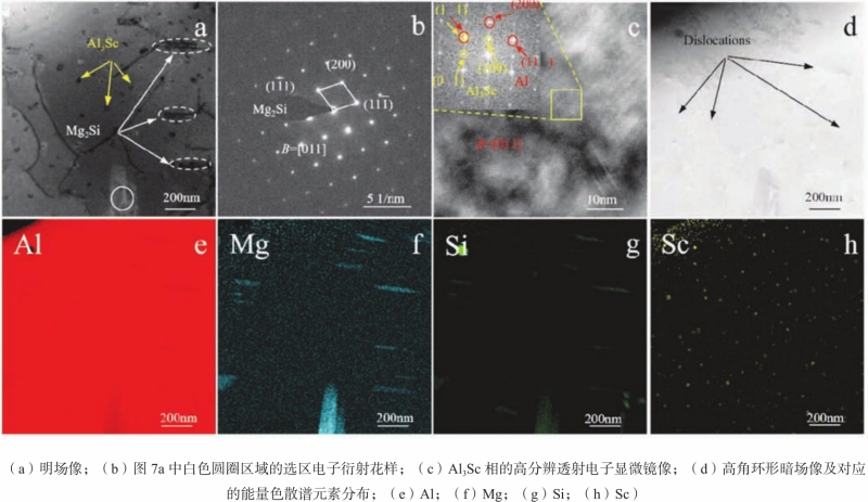 图5 530 ℃不同固溶时间下合金的SEM照片 2.4 T6 态合金 Al3Sc 相和 Mg2Si 相的 TEM 分析 图6为T6态(530 ℃固溶6 h水淬,再经160 ℃时效10 h处理)合金中Al3Sc和Mg2Si相的TEM照片。图6(a)为α-Al基体晶粒内明场像(BF)照片,从图中可以看出合金中存在大量细小弥散的黑色沉淀颗粒(图6(a)中黄色箭头标记位置),以及层片状沉淀相(图6(a)中白色虚线椭圆和白色实线圆标记位置)。其中实线圆选定位置沉淀相的衍射花样见图6(b)所示,对其进行标定可知,该沉淀相为Mg2Si,晶带轴为[011]。同时,对比图6(a)中Al、Mg、Si、Sc元素Mapping结果,图6(f)~6(g),也可以观察到,Mg和Si元素在该沉淀相上的富集。此外,还发现图6(a)中白色虚线椭圆标记位置的层片状沉淀相,也由Mg和Si元素富集,表明其同为Mg2Si沉淀相,这种尺寸较小(长约200 nm)的Mg2Si与上述尺寸稍大Mg2Si沉淀的生长方向存在差异,呈垂直析出生长关系。另外,对图6(a)中颗粒相所在区域进行高分辨(HRTEM)照片采集,结果如图6(c)所示。标定图6(c)中黄色方框选定区域FFT处理后的衍射斑点(图6(c)左上角)发现,α-Al基体[011]晶带轴下,黄色圆圈位置为Al3Sc斑点,红色圆圈位置为α-Al基体斑点,说明基体中析出的沉淀颗粒为L12型Al3Sc,图6(e)和图6(h)结果也能反映出这些沉淀颗粒主要由Al和Sc元素富集。进一步分析图6(a)和图6(c)中衍射斑点,得到Al3Sc与α-Al存在(100)Al3Sc//(200)α-Al共格关系。α-Al基体[011]带轴下,晶粒内的大尺寸及小尺寸Mg2Si分别沿α-Al基体<200>和<111>方向析出生长。图6(d)为图6(a)的HAADF像,可以看出基体中存在许多位错线,且这些位错运动受到Al3Sc和Mg2Si沉淀相的抑制作用,这有利于强化合金的力学性能。