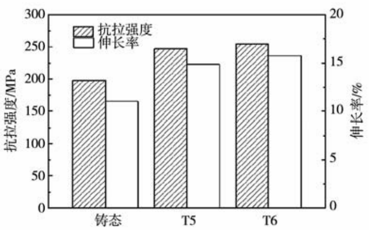 图7 不同时效工艺合金的硬度曲线 采用图1所示尺寸的试样(非国标样)进行拉伸测试,得到不同状态下合金的室温拉伸性能见图8。和铸态合金相比,T5(530 ℃固溶6 h空冷,再经160 ℃时效10 h处理)和T6处理后合金的抗拉强度和伸长率均实现了显著提升。具体而言,经T5固溶处理后,合金力学性能的增强主要得益于固溶强化机制,其中抗拉强度较处理前提升了近 60 MPa。合金经T6处理后,其力学性能最好,这主要是由于合金中析出了Al3Sc和Mg2Si沉淀相,这些沉淀相能够有效抑制位错运动,其产生的沉淀强化作用有利于进一步提高合金力学性能。
