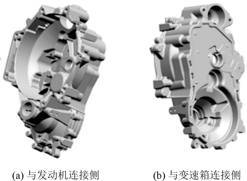 汽车离合器是安装在发动机与变速器之间的总成部件,是发动机和传动系统之间传递动力的部件。离合器壳体起到连接、支撑和保护离合器内部零部件的作用,提高离合器工作的稳定性。图1为某型手动挡汽车离合器壳体,其外轮廓尺寸为477 mm×358 mm×130 mm,平均壁厚为3.5 mm。从铸件结构来看,壳体铸件在两侧不同方向有两个腔体组成,一侧与发动机飞轮组连接侧有ϕ276.5 mm×122 mm的腔体,另一侧与变速器壳体连接侧有最大直径为ϕ189 mm台阶状的腔体,铸件两侧平面及侧向有多处螺栓安装凸台形成的厚壁区域。铸件材质为AlSi9Cu3(Fe),质量为6.1 kg。铸件加工后需要进行密封测试,在0.1 MPa压力下,泄漏量小于20 mL。