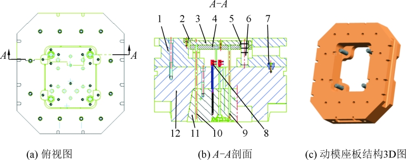 离合器壳体动模推出机构的结构优化方案见图9,动模座板采用一体式结构,装配时首先将推板导柱安装在动模座板的内台阶面上,推板导柱共4件分布在动模套板内腔四角处;定位销安装在动模座板与动模套板的结合面上。然后将带有推板导柱和定位销的动模座板安装到动模套板上,用螺栓固定连接。之后将推杆、复位杆、推板导套按顺序安装在推板上,再用螺栓与推板固定为推出组件,将推出组件安装到动模座板中;最后固定4个压盖式限位块。维修维护更换易损件时,只需将4个小限位块拆下,即可将带推杆的推出组件取出,方便、安全、可靠。