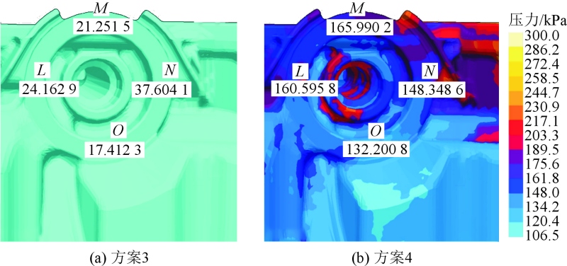 从模拟结果分析,根据铸件的填充气压对比,通过对滤清器安装面的取点测量可知使用方案3抽真空工艺比使用方案4大气排气的气压数值低,气压数值平均低约131.8 kPa,因高气压引起的气孔外露风险降低。图8为两个方案的气压模拟对比图,表4为两个方案的取点气压对比数据表。方案3为抽真空排气模拟,方案4为常规大气排气模拟。