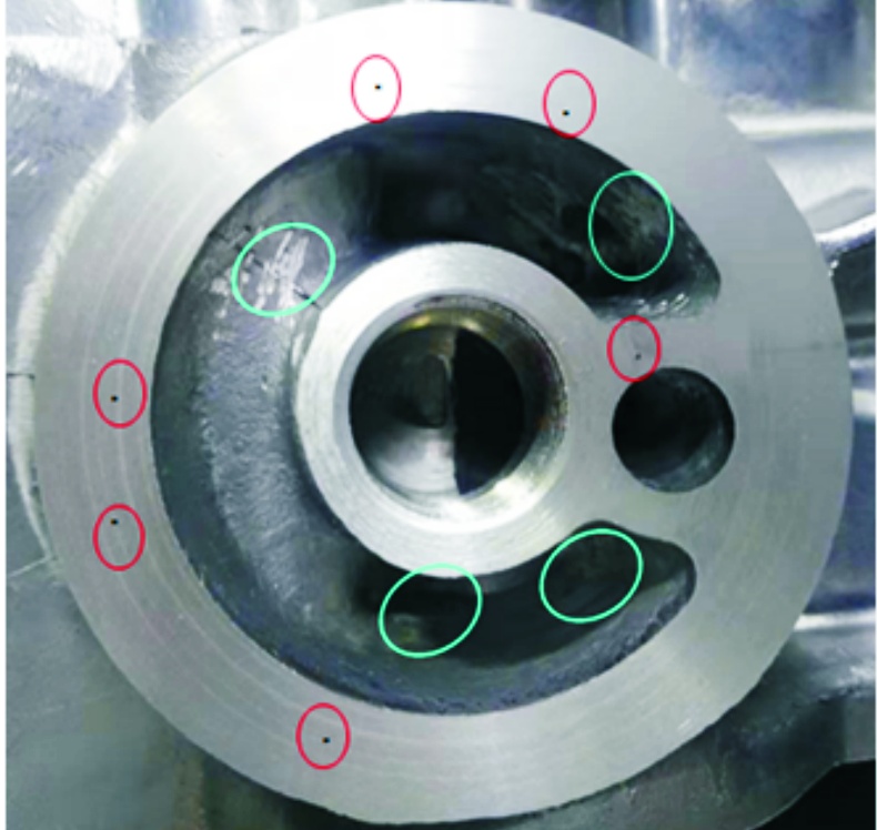 图2为铸件连接滤清器局部位置图。根据初步分析,该铸件连接滤清器的部位结构较复杂,红色区域(基于原图为彩色描述,下同)较深且狭小(深26 mm,宽7 mm)。该位置的模具镶件用传统技术加工出来的冷却水道不能深入底部并环绕一周,冷却效果差,造成红圈区域烧伤严重并且漏气。同类型铸件不仅在该位置的烧伤比较严重,而且有机加工后出现气孔外露的现象。图3为同类型铸件的缺陷图所示,红圈为气孔缺陷,蓝圈为烧伤缺陷。因此如何提高该区域的冷却效率及减少气孔是整个压铸工艺设计的难点。