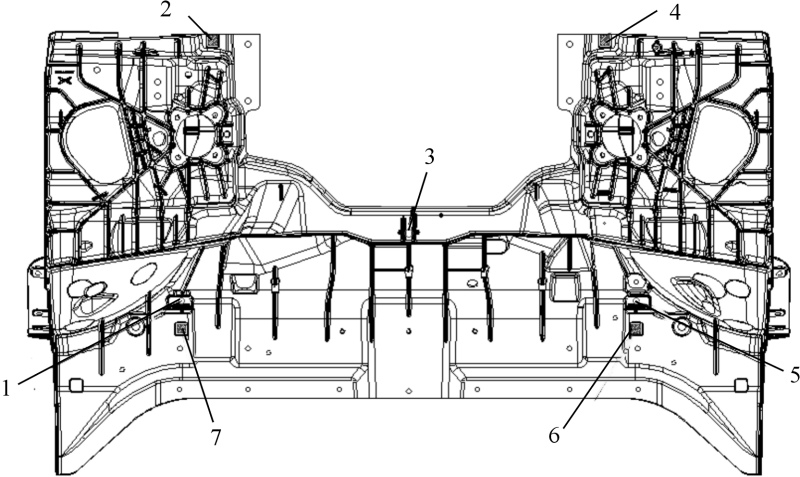 XY平面方向定位:前舱铸件外形尺寸巨大,相比传统的压铸件,铸件的变形量也较大。经过压铸模拟分析,发现在压铸工艺的中部区域以及前端部位,铸件的变形程度相对较小,即便存在变形情况,也主要表现为从中间向轮毂两端的方向轻微拉长。图4为前舱铸件的机加工定位示意图。