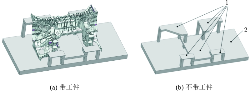 前舱压铸零件见图1。该零件轮廓尺寸为1 650 mm×950 mm×630 mm,质量约为57 kg,具有显著的中间对称性,且包含210个加工特征,包括28个螺纹孔、136个光孔以及46个加工面;铸件最高位置精度为基准孔位置精度,为±0.1 mm。基于以上分析可得,相比其他产品,一体化铸件前舱的机加工难点主要体现在两个方面:尺寸巨大、加工特征极多,对加工设备的行程要求极大,且要考虑高效加工;复杂、深腔结构需求的加工摆放角度达到了20个以上。尺寸大且精度较高,最高位置精度为±0.1 mm,且夹具尺寸及质量增大,为保证高效加工,夹具需要减重;前舱的材料为免热处理铝合金材料,此材料偏软、伸长率高,导致加工切削力大、易粘刀和热变形,对刀具要求高。因此,本项目的目标加工设备需要满足大行程、多角度、高刚性及加工效率高等技术要求,加工夹具需要提升加工刚性才能保证加工效率。