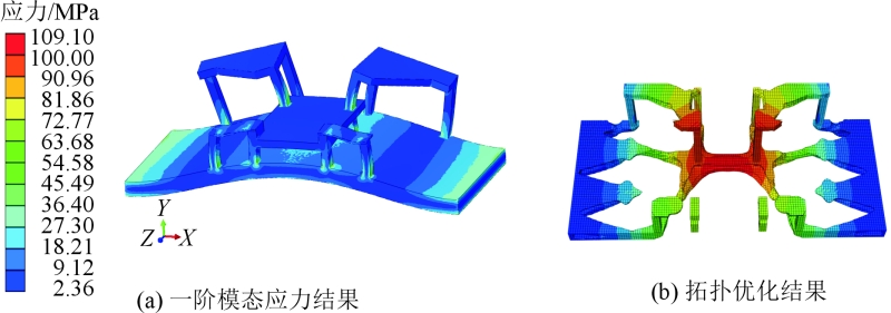 前舱铸件的尺寸较大,为1 650 mm×950 mm×630 mm,这给相关的夹具设计带来了全新的挑战。按照传统的夹具设计模式来进行设计,夹具的质量将会增大,甚至可能达到2.5 t。然而, CNC设备的第6轴转台的承重能力最大仅为1.2 t。这说明按照传统方式设计的夹具质量将远超过转台的承重能力,从而无法进行正常的加工操作。为了克服这一难题,需要对前舱铸件的夹具整体框架结构进行轻量化设计,通过夹具镂空减重技术,将夹具质量控制在1 t左右。根据夹紧位置和辅助支撑位置,确定出夹具的大致构造,见图5,由1个基座和5个平台构成。对图5的结构进行一阶模态分析和施加载荷进行拓扑优化,结果见图6。