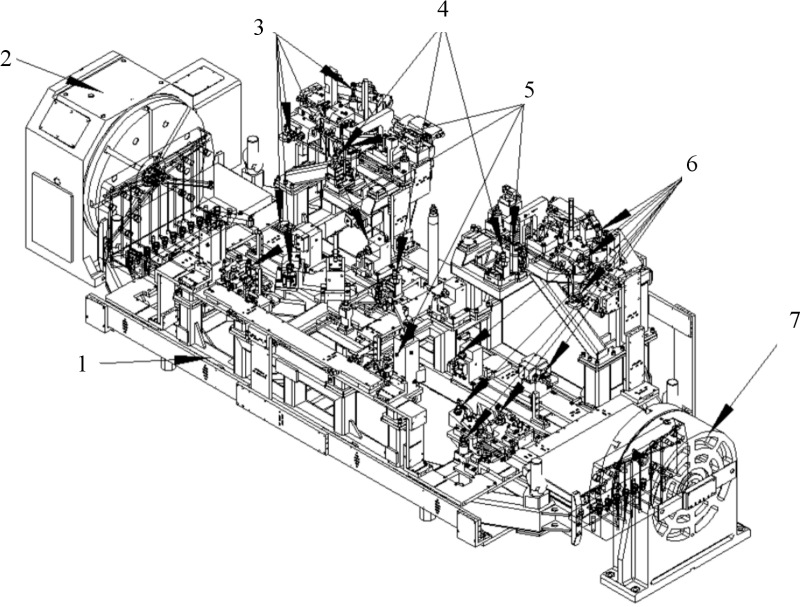 1.夹具整体框架 2.转台头架 3、6.辅助支撑及压紧 4.定位圆销 5.主支承及压紧 7.转台尾架