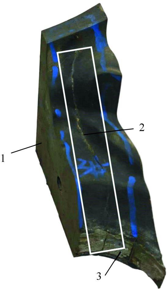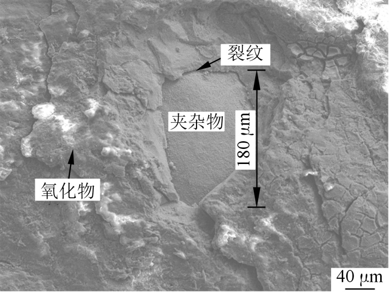 图1 失效模具照片 在浇口裂纹处切取试样,将试样在酒精中用超声波清洗干净,利用扫描电镜对裂纹表面形貌以及表面成分进行测试。图2为模具浇口裂纹断面的SEM形貌。可以看出,裂纹断面处形成了大量的金属氧化物,这是由于长时间暴露在高温环境下造成的,还发现尺寸较大的夹杂物(180 μm左右),夹杂物表面光滑且夹杂物和基体之间有裂纹形成。对图2区域进行EDS测试,结果见图3。可以看出,夹杂物区域的Mn、Cr、V含量明显高于基体,可以确定该夹杂物为金属夹杂物。在高温服役条件下,热工模具钢由于回火马氏体的动态回复、再结晶和塑性变形的产生导致力学性能有所下降,当温度达到600 ℃时,钢的抗拉强度和硬度只有原来的1/2。在循环热应力作用下,模具钢中大尺寸夹杂物与基体的应变分布不均匀,形成应变梯度促使裂纹萌生。