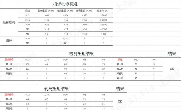 压铆螺母拧紧扭矩、剥离扭矩、破坏扭矩以及推出力都满足标准要求。 综合以上实验结果: