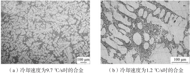 图3 不同Mg含量的Al-Si-Mn-Mg合金的高倍金相组织 图4是Mg含量为0.5%的Al-Si-Mn-Mg合金在不同冷却速度下的金相组织,可以看出,较小的冷却速度使得合金中α-Al枝晶的二次枝晶臂明显粗大,同时共晶Si的变质效果随着冷却速度的降低而变差,在Si相富集区共晶Si形态相较于高冷却速度来说更加粗大。这都是因为较低的冷却速度所导致的更长的凝固时间和更低的凝固速度,使得合金中各相形核后持续长大,导致合金的组织粗大。