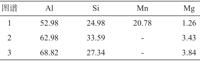 图4 不同冷却速度的Al-Si-Mn-Mg合金的金相组织 对冷却速度为9.7 ℃/s的Mg含量为0.5%的Al-Si-Mn-Mg合金进行扫描电镜(SEM)观察和能谱分析(EDS),见图5和表2所示。由EDS分析可以看出,在Mn元素含量过多时,合金中沿着二次枝晶臂析出的大量针状相为富Mn相,该相明显的棱角与边界在合金承受载荷时会引起较大的应力集中,导致合金力学性能下降,同时可以看出,在Al-Si-Mn-0.5Mg合金中,Mg在整个合金基体中都有不同程度的分布,但在Si相附近形成区域富集,Ti元素在α-Al基体中分布均匀。