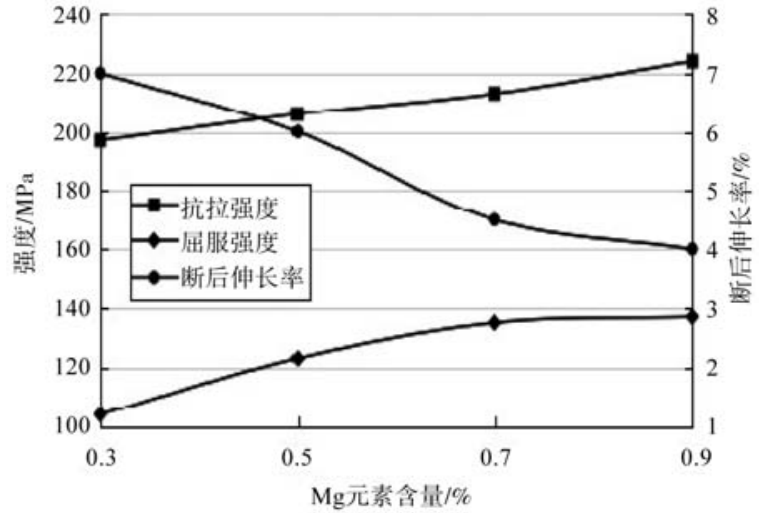 表2 0.5%Mg含量的Al-Si-Mn-Mg合金EDS分析 wB/% 2.2 Mg 对 Al-Si-Mn-Mg 合金力学性能的影响 选取同一成分同一炉次的多根试棒进行拉伸试验,每组成分选取5-6根试棒拉伸并取平均值。冷却速度为9.7 ℃/s的Al-Si-Mn-Mg合金铸态力学性能如图6所示。从图中可以看出,随着Mg含量的提高,合金的抗拉强度及屈服强度都有着不同程度的提升,而合金的断后伸长率出现明显下降,极限抗拉强度由197 MPa提升至224 MPa,提升了约12%,而断后伸长率由7%下降至3.5%,降低了50%。在Mg含量从0.5%增加至0.7%时,断后伸长率急剧下降,从6%下降至4.5%。这是由于随着Mg元素的加入,合金在凝固时析出强化相Mg2Si,提升了合金的抗拉及屈服强度,但是由于脆性的Mg2Si相及共晶Si在拉伸过程中容易产生应力集中,易产生微裂纹,加速合金的断裂,使得合金的断后伸长率出现较为明显的下降,同时Mg对于Sr变质作用的影响也导致Si相的粗大,进一步影响合金的塑性。