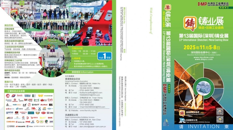 ![]() 2025年11月5日至8日,备受行业瞩目的“DMP 2025大湾区工业博览会”将在深圳国际会展中心(宝安)盛大开幕。作为DMP大湾区工博会的重要组成部分,“2025第十三届国际(深圳)铸业展”将同期举办,汇聚铸造与压铸行业前沿技术与创新成果,打造一场立足华南、辐射全国、连接世界的行业盛会。 由香港铸造业总会与讯通展览公司联合主办,经过多年发展,“国际(深圳)铸业展”已发展成为华南地区最具影响力和专业性的压铸及铸造行业展会之一。本届展会吸引了近百家来自压铸、铸造及相关产业链上下游的优质企业踊跃参展,全面覆盖从原材料到终端应用的完整产业生态。