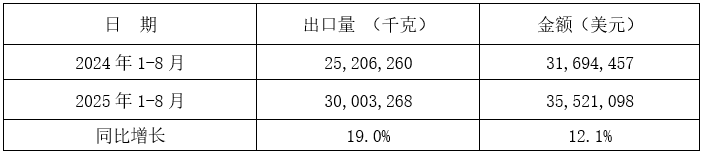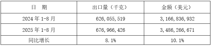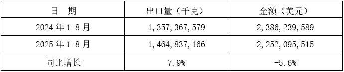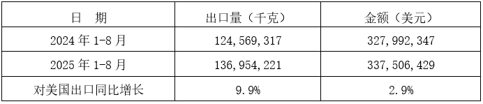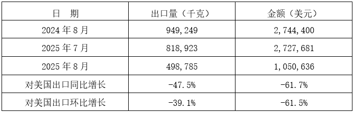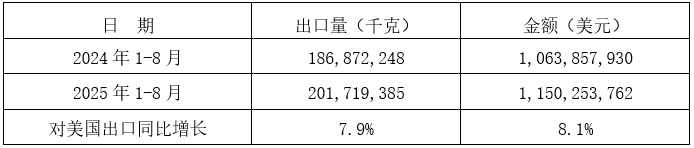 其中8月份,20个税则号共计出口55.5万吨,同比增长1.1%,环比增长3.7%;出口金额15.5亿美元,同比增长3.1%,环比增长3.5%。对美国出口11.1万吨,同比下降24.4%,环比下降17.6%;对美国出口金额3.4亿美元,同比下降7.9%,环比下降4.3%。