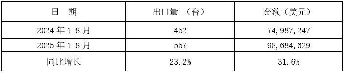 其中:8月份出口77台,同比增长40.0%,环比下降17.2%,见表19和表20。