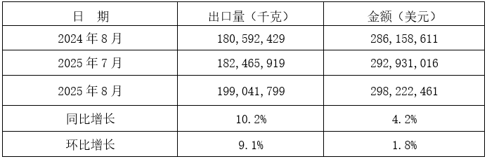 其中:8月份出口119.9万吨,同比增长10.2%,环比增长9.1%,对美国出口1.6万吨,同比下降27.9%,环比下降17.5%,见表2-表5。