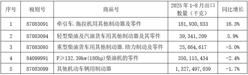 表 8:2025年1-8月汽车零部件对美国出口情况