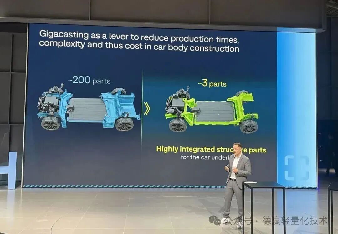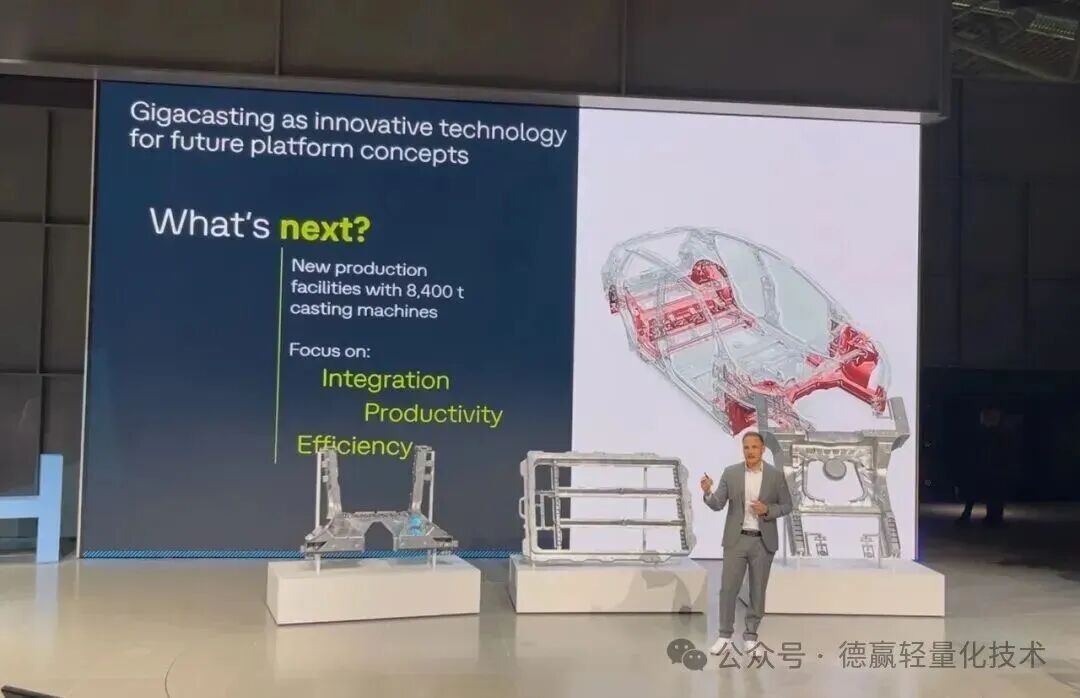 ![]() 日前(2025年9月9日至14日),在慕尼黑举办的IAA Mobility 2025车展上,大众汽车在技术日发布会上宣布将为多款即将上市的入门级电动车采用一体化压铸技术。 初期战略包括整合大型铝铸电池托盘,或更精确地说,托盘框架。该技术将率先应用于全新大众ID. Polo、Cupra Raval、Škoda Epiq以及尚未公布量产版的VW ID. Cross。 马克·亚当博士在会议中探讨了大型铸件的未来发展,强调其能缩短生产周期、降低复杂度并实现成本节约,同时透露可能规划新建配备8400吨压铸机的工厂,重点提升集成化、生产力和效率。 演讲还展望了大众“一体化压铸”战略的扩展前景,将其定位为高产量电动平台的里程碑。 大众尚未就前后底盘一体化压铸方案作出最终决定,但明确表示若未来选择“特斯拉路线”,则需采用演讲中提及的8400吨级等一体化压铸机。