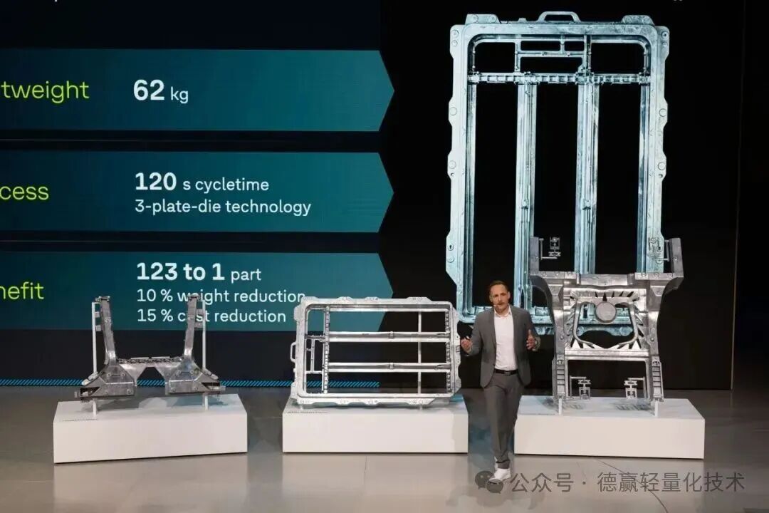 此次展会上还展示了在德国卡塞尔使用 4,400 吨压铸机制造的较小的前后一体化压铸零部件(见下文),但它们作为探路者,是研发工作的关键,不会出现在大众未来的车型中。