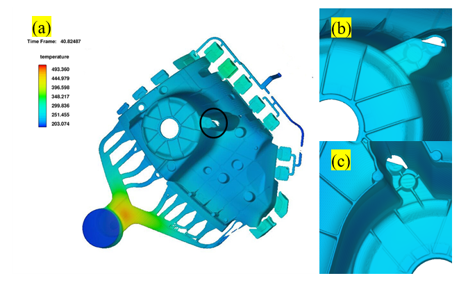 图6. 凝固过程模拟 图6为金属液完全凝固后所得铸件的形状。可以看到,在减震塔零件中的凸起结构上部存在一较大的孔洞缺陷,观察其局部放大图可以发现,在该处存在两个尺寸较大的近圆柱形凸台,高度达到20mm。在凝固过程中,这一厚大部位凝固速度较慢,会发生补缩现象,形成孔洞。 对此,采取局部激冷的方法加快该部位的凝固速度,以获得致密的铸件。在该处的模具上加入激冷铜块以达到激冷的目的[13],其模拟结果如图7所示,得到内部致密无孔松的健全铸件。最后采用该工艺实际生产出合格的铝合金减震塔零件,成品率达到90%以上。若通过控制模具温度等其他条件,成品率有望进一步提高。
