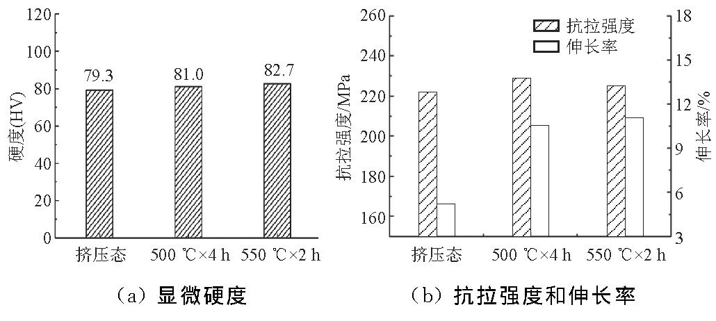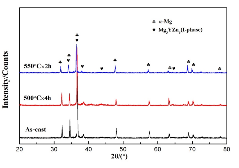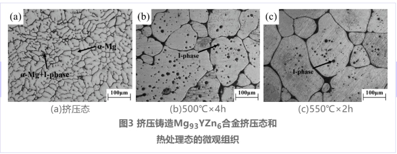 图3可知,合金中的共晶组织为α-Mg基体相和准晶I相。在凝固过程中,Mg93YZn6合金中的α-Mg相首先从液相中析出,然后溶质的重新分配导致Y集中在初生准晶I相区周围,形成共晶组织。所有的共晶组织都以初生I相颗粒为核心,并被α-Mg相分割。挤压铸造Mg93YZn6合金中第二相准晶颗粒分布在晶界上,由于第二相颗粒对于晶界具有钉扎作用,微观组织中弥散分布的准晶相可以阻碍晶界的扩展和迁移,能够有效阻止合金晶粒长大,使合金的晶粒得到细化,见图3a。从图3b和图3c中可以看出,热处理后的显微组织结构变化很大。热处理后,合金的晶粒平均尺寸显著增大,这是因为晶粒在长时间的热处理过程中长大。此外,在图3b和图3c中,α-Mg相中析出了球形的准晶I相。在500℃和550℃下长时间热处理后,I相的形态发生了改变。图3c和图3b相比,析出的球形I相明显减少,这说明在550℃下固溶2h后,合金中部分I相发生了溶解,在凝固的过程中I相没有全部析出。
