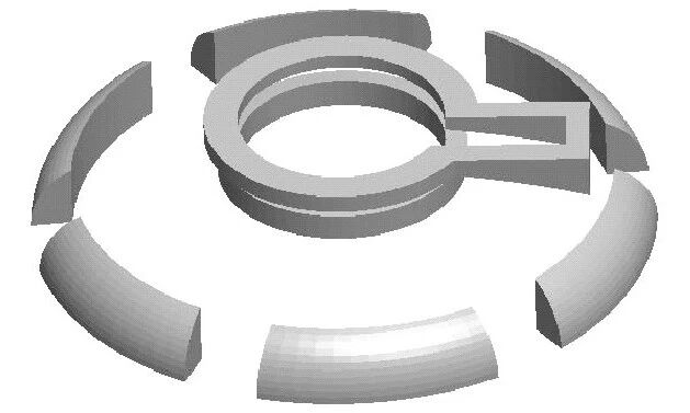 图5 冷铁设置 可以看出,缩孔存在于铸件顶端。两款软件的模拟结果基本一致,缩孔产生的位置大致相同,而且都没有完全集中于冒口处,不同的是缩孔的形状尺寸。从图4a可以看出,铸件顶端的缩孔呈现上小下大的形貌,而图4b呈现上大下小的状态。为了解决缩孔问题,考虑在铸件顶端设置冷铁,从而改变其凝固速度,形成顺序凝固使缩孔集中于顶端冒口处,提高过冷度,增加更多的晶核,细化晶粒尺寸。通过分析得知,缩孔产生于铸件顶端,为了增强补缩能力,添加冷铁。已知铸件顶端设置了直径约为30mm的冒口,于是设置冷铁将铸件顶端凸起处上下包围,上表面放置约8mm的冷铁,下表面放置12mm厚的冷铁,并且在隔板四周下端添加冷铁,尽可能使缩孔集中于冒口处,以避免铸件缩孔,见图5。