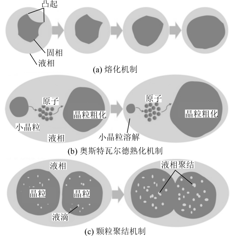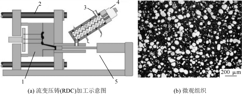图8 半固态组织演化过程中机制演变示意图 3 镁稀土合金半固态成形工艺研究进展 半固态成形技术在镁合金领域的应用逐渐增多,特别是在汽车制造和消费电子行业。镁合金半固态成形工艺包括触变成形和流变成形,其中流变成形工艺如流变压铸(RDC)和流变挤压铸造(RSC)能有效解决卷气问题,适合Mg-RE合金。研究显示,半固态成形铸件的微观组织和力学性能得到改善,且可进行时效处理。国内对镁稀土合金的半固态成形进行了研究,发现Gd含量变化影响合金的显微组织和力学性能,而低频电磁搅拌和超声振动技术有助于制备高质量的半固态浆料。触变成形工艺中,液相偏析是常见问题,减小α-Mg颗粒尺寸有助于减轻此问题。注射成形技术在镁合金制备中受到关注,其工艺流程包括感应加热、精确控温和注射成形,适用于新能源汽车和3C电子领域。镁合金半固态注射成形技术展现出晶粒细化效果,但目前尚未见有关镁稀土合金的研究报道。随着材料基因工程技术的发展,有望推动镁稀土合金在大型复杂结构件领域的应用。
