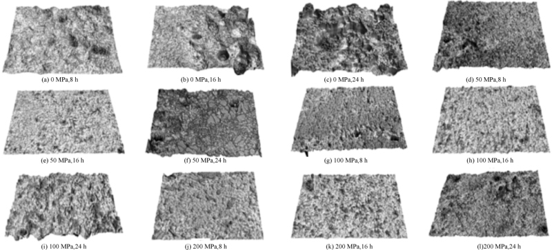 图19 不同压力下RSC试样在不同浸泡时间下的三维腐蚀形貌